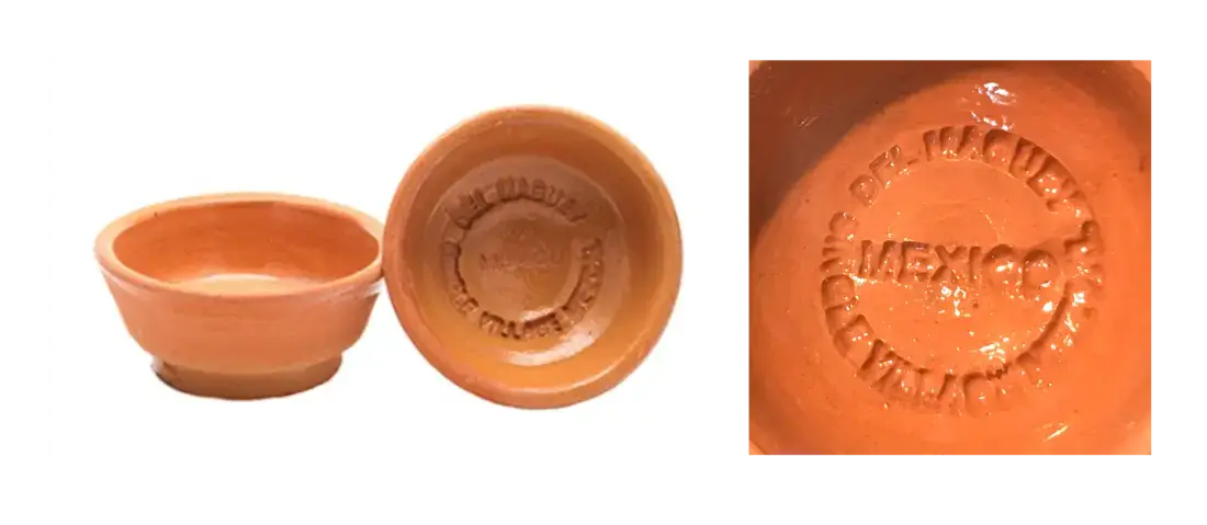 The cup is made of red clay, with applied enamel on the surface that holds liquid inside. It holds a maximum of 1 oz, and measures 2.5 inches wide and 1 inch in height. The copitas can be identified by the embossed brand name “Del Maguey Single Village Mezcal” which encircles the word “Mexico” located on the inside of the cup. Images of the copitas and the VAPs sold at retail are pictured below.