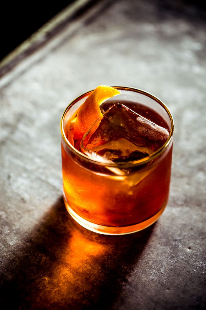 Combine all the ingredients, except the garnish, in a mixing glass filled with ice and stir until well chilled. Strain into a rocks glass over one large ice cube. Garnish with the orange peel.