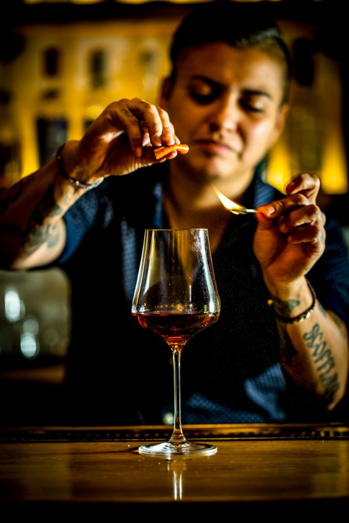 In a wineglass, combine all the ingredients, except the bitters and orange peel, without ice and swirl gently. Mist three small bursts of bitters onto the surface of the cocktail and along the inner sides of the glass. In one hand, hold a lighted match over the drink and, in the other hand, the orange peel, with the orange side facing the flame about an inch away. Carefully and quickly squeeze the orange peel until its oils spark, then drop the peel into the cocktail.